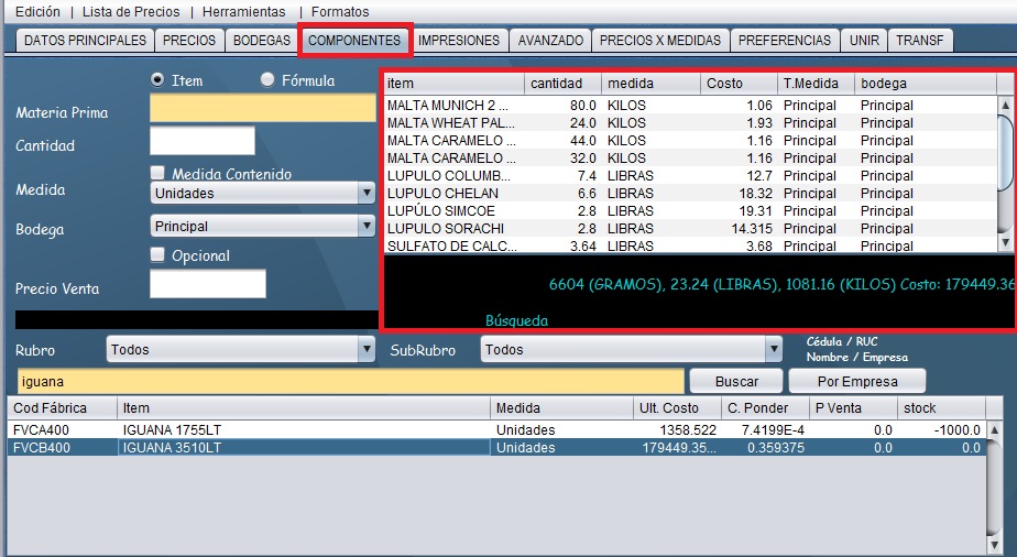 - Diríjase a la pestaña de "Componentes" donde podrá visualizar la receta del producto seleccionado previamente