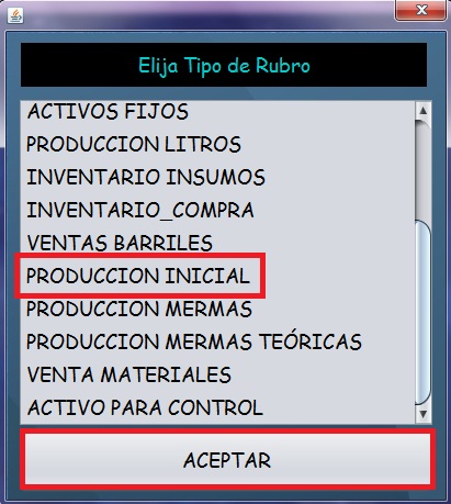 - Aparecerá la siguiente pantalla, selecciones "Producción Inicial" y luego "Aceptar"