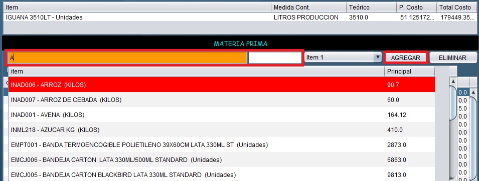 - En la siguiente pantalla, en la barra de búsqueda escriba el producto del cual desea ingresar/editar receta, y dar doble clic para que se cargue