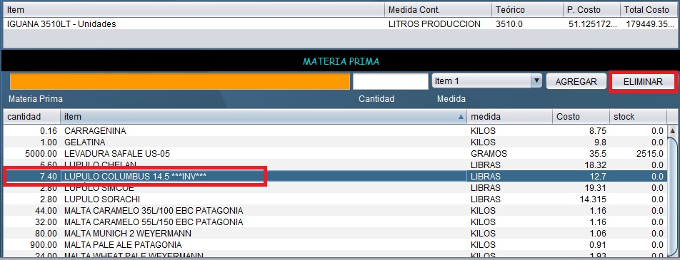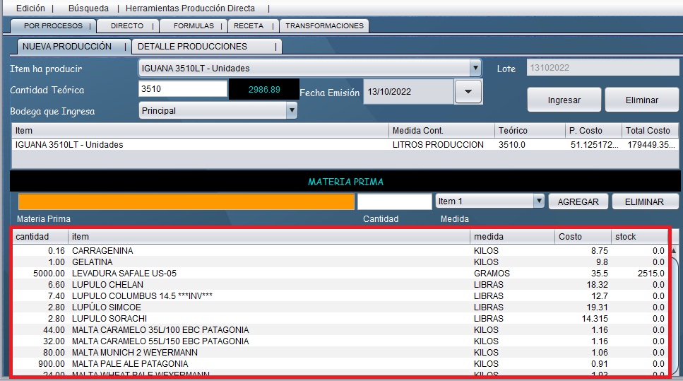 - Podrá visualizar la receta base que se creó previamente para la producción