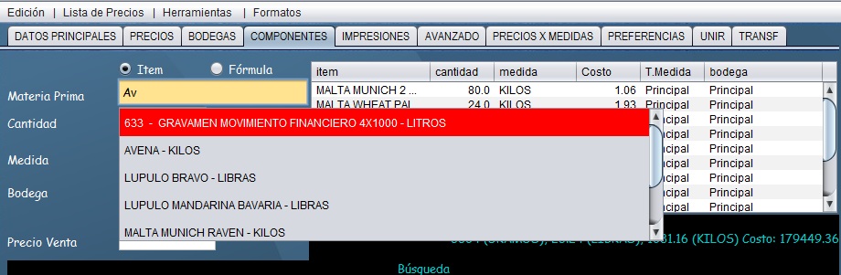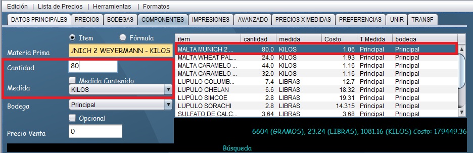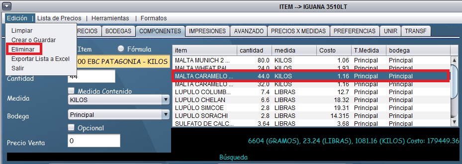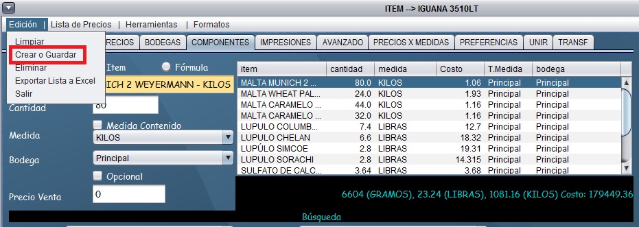 - Si desea agregar un nuevo componente, seleccione Edicion, limpiar e ingrese el componente que desea agregar con la cantidad respectiva.