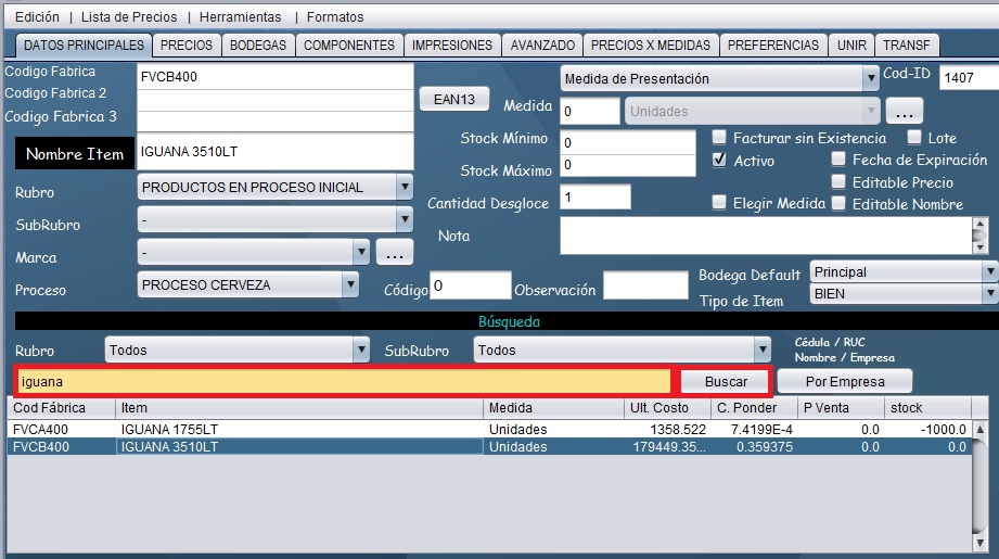 - En la barra de búsqueda coloque el nombre/código del item que desea buscar y de doble clic en la parte de Stock Final