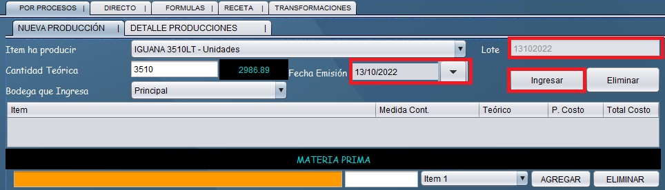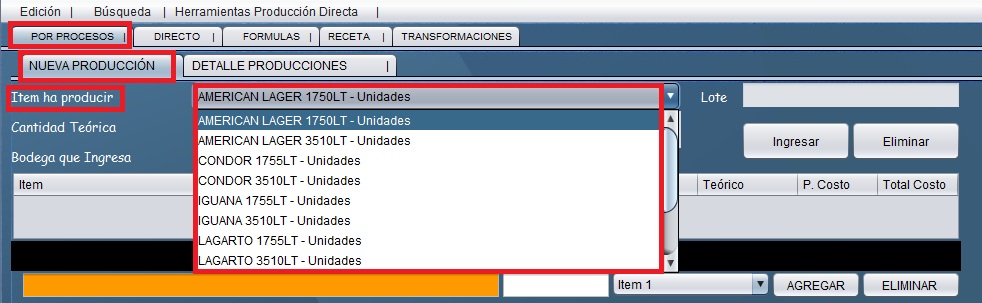 - En la pestaña Nuevos Procesos y Nueva Producción, seleccione el Item del cual va a iniciar producción