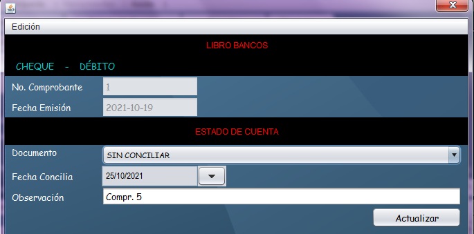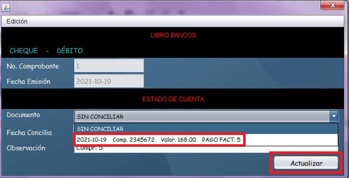 - Presione doble clic sobre los registros que no han sido conciliados, se mostrará la siguiente ventana: