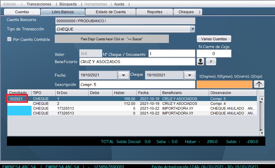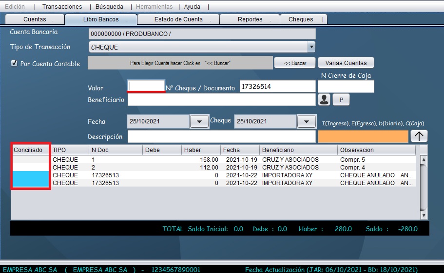 - Se mostrarán los registros que no han sido conciliados en blanco en la parte señalada: