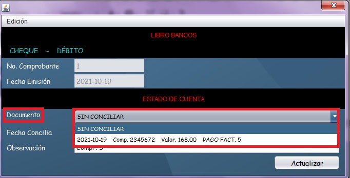 - En la opción "Documento", se mostrarán los registros del estado de cuenta que coincidan con el registro seleccionado en el libro bancos.