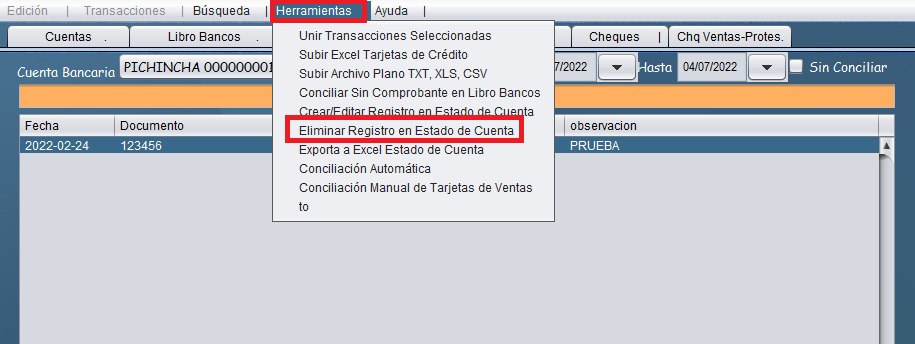 - Seleccione el registro, diríjase a la pestapestaña de "Herramientas" y de clic en "Eliminar registro en estado de cuenta"