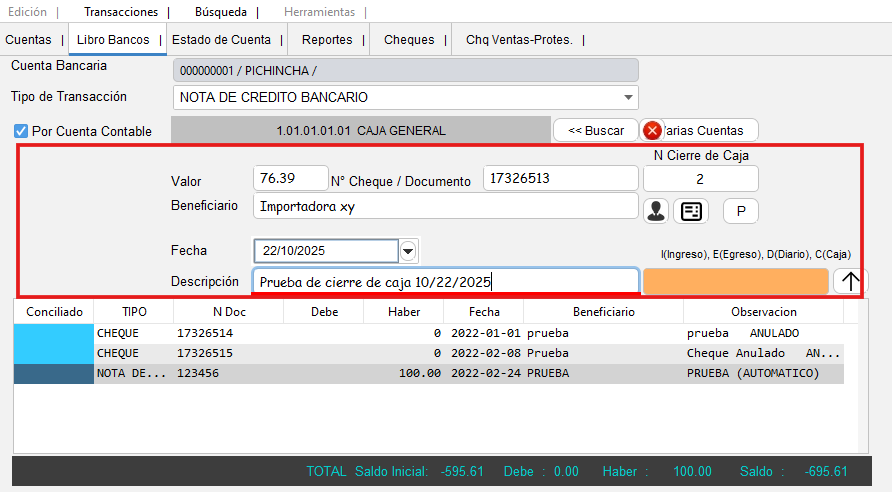 - Selecciona el banco y el tipo de transacción como "Nota de Crédito"