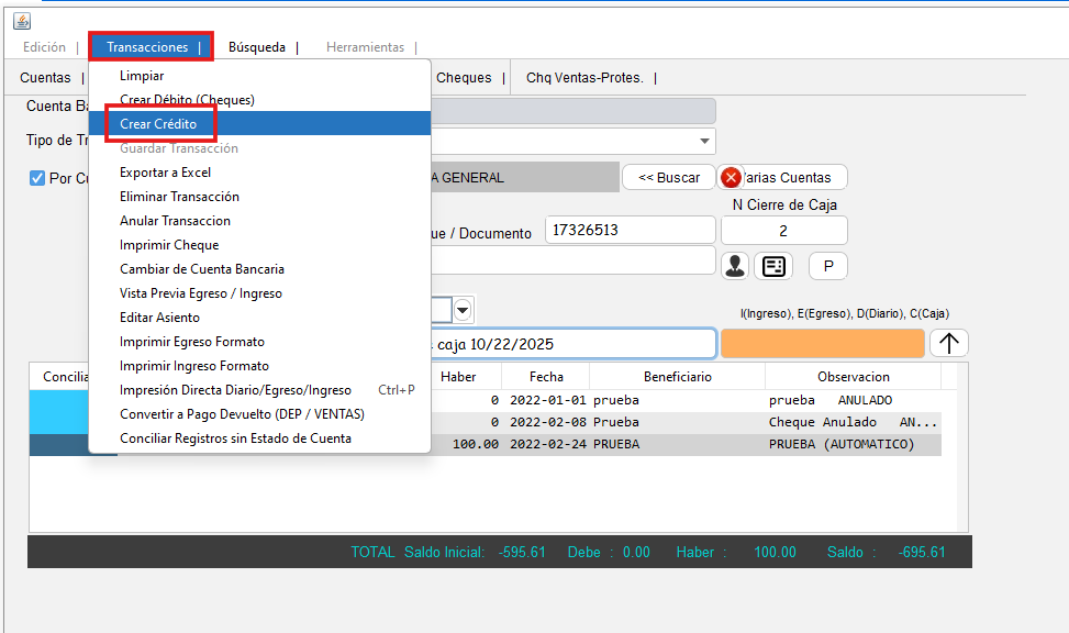- Luego ve al menú "Transacciones" y selecciona la opción "Crear crédito"
