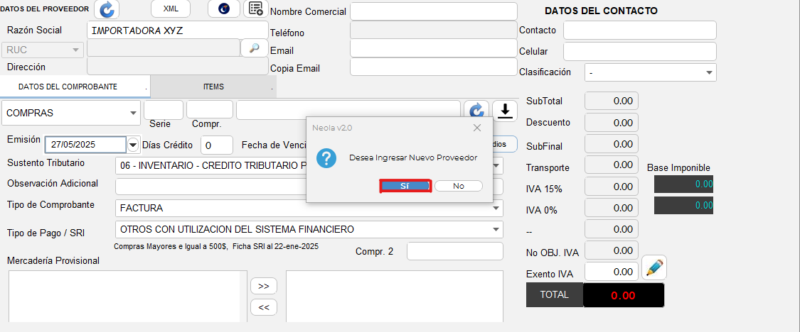 - Se mostrará una ventana de confirmación con el mensaje "Desea crear nuevo proveedor", confirma con un clic en el botón "Sí"