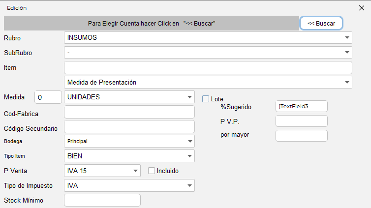 - Se mostrará una nueva ventana donde debe ingresar los datos del nuevo item, ingrese los datos principales como código, precio, iva, la medida de presentación, los datos que requiera según su actividad.