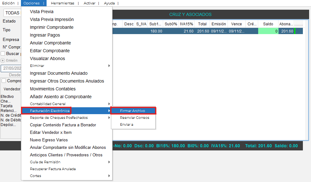 - En la pestaña Opciones, selecciona Facturación Electrónica, y posteriormente Firmar archivo