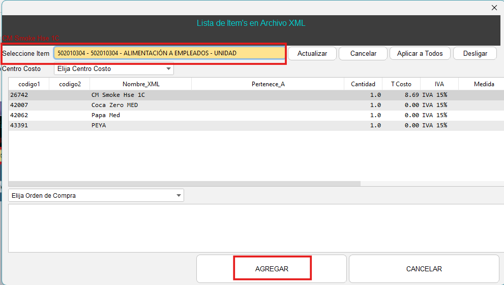 - Completa el campo de "Seleccione Item" colocando correctamente el item al que pertenece, luego selecciona "Actualizar" y "Agregar"
