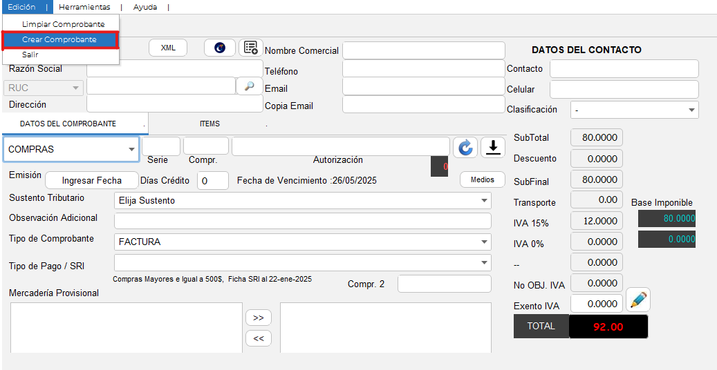Menú interno, en el grupo Edición, haga clic en la opción Crear Comprobante.