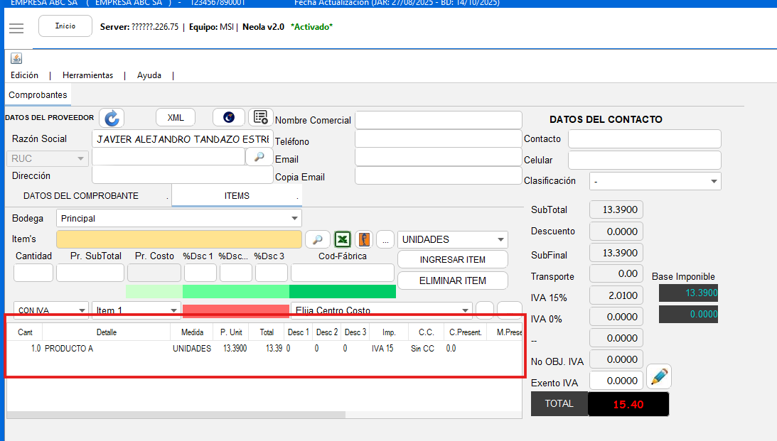 - Ingresados ya los items verifique que el valor de la compra en el sistema sea igual a la de la factura en pdf.