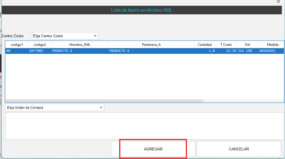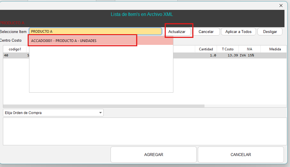 - En este ejemplo vamos a trabajar con el item PRODUCTO A. En la parte superior nos da la opción “Seleccione Item”, en este barra de búsqueda debemos ubicar al item que vamos a cargar dentro de nuestro sistema, una vez seleccionado el, item presione "Actualizar" y para finalizar "Agregar".