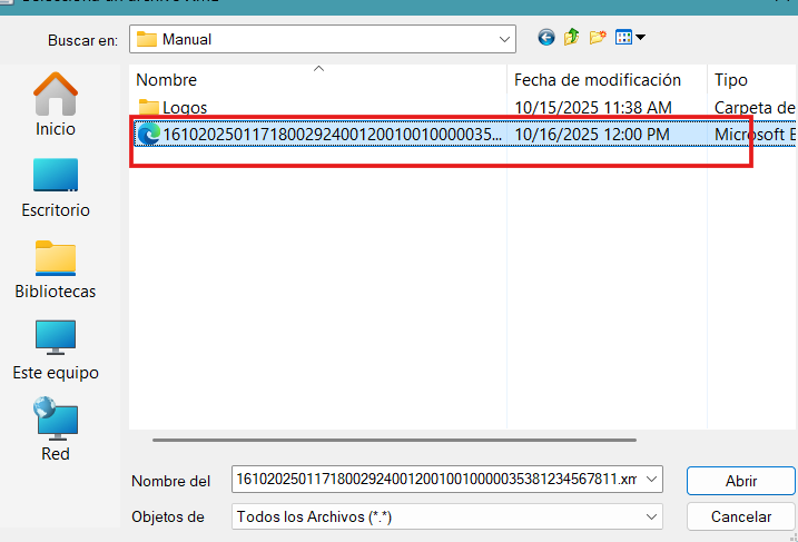 - A continuación se mostrará una pantalla donde debe elegir el archivo .xml previamente descargado y presione el botón "Abrir".