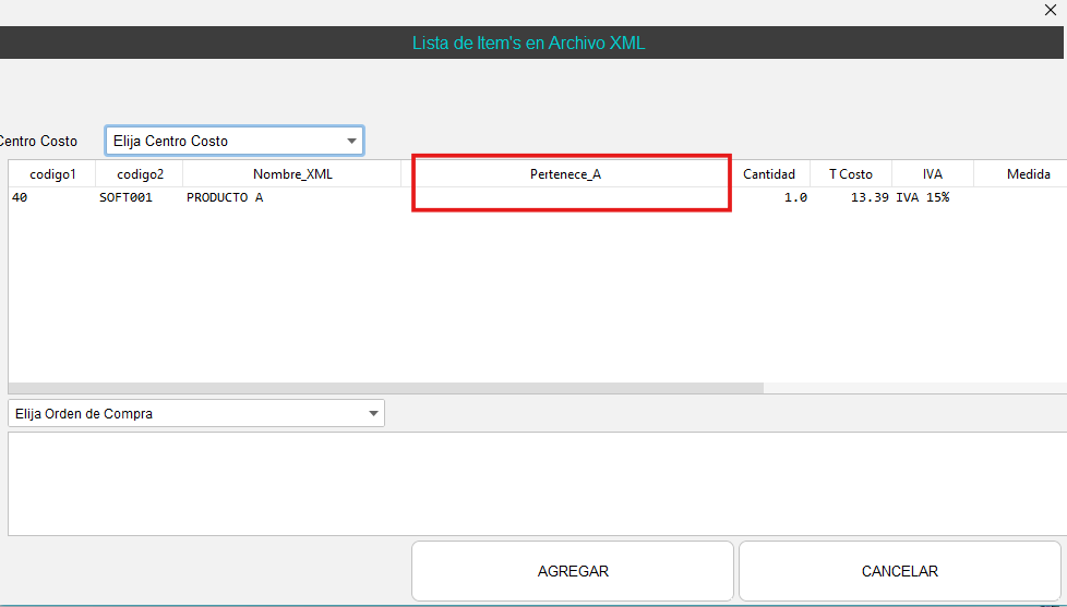 - Posteriormente, se abrirá una pantalla donde se deben enlazar los productos de la factura que se encuentran en la fila Nombre_XML con los productos de nuestra base de datos.