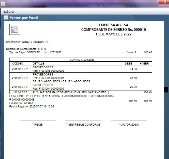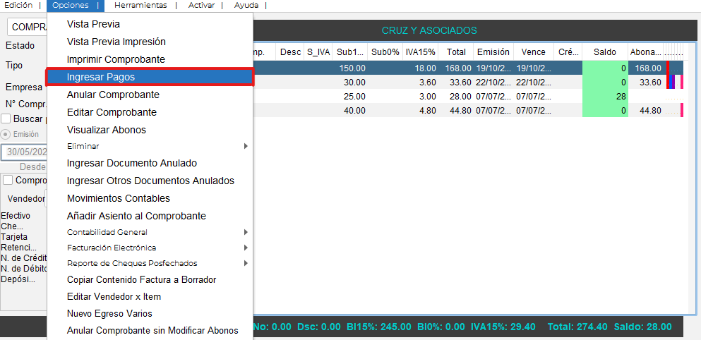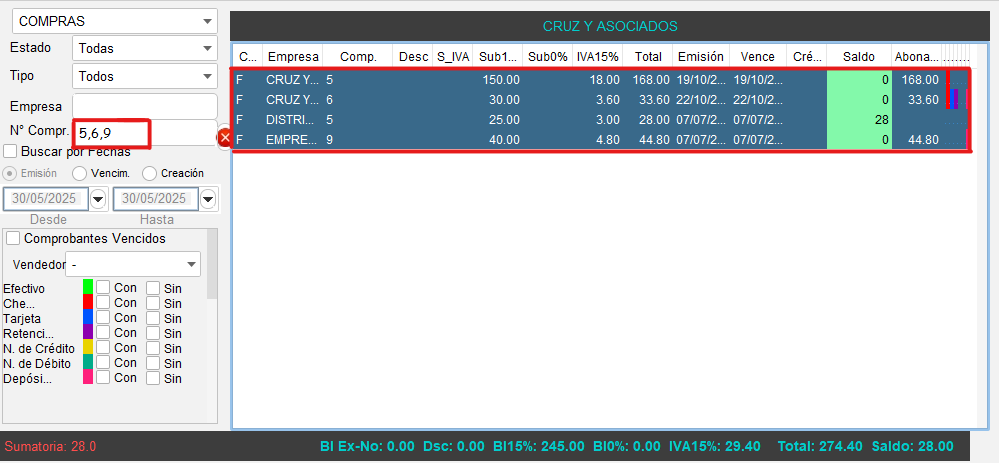 - Selecciona las facturas o compras que deseas cancelar, mantén presionada la tecla "Ctrl" mientras seleccionas las facturas, o coloca en el campo Nº de comprobante, aquellas facturas que desea cancelar separados por una coma ","