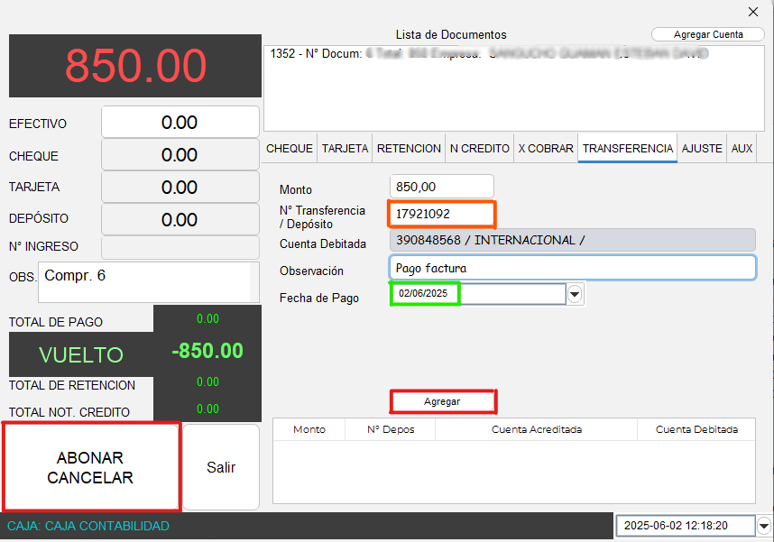 - Completa los campos que se indican, de acuerdo al comprobante que el banco te proporciona. Selecciona "Agregar" y "Abonar"