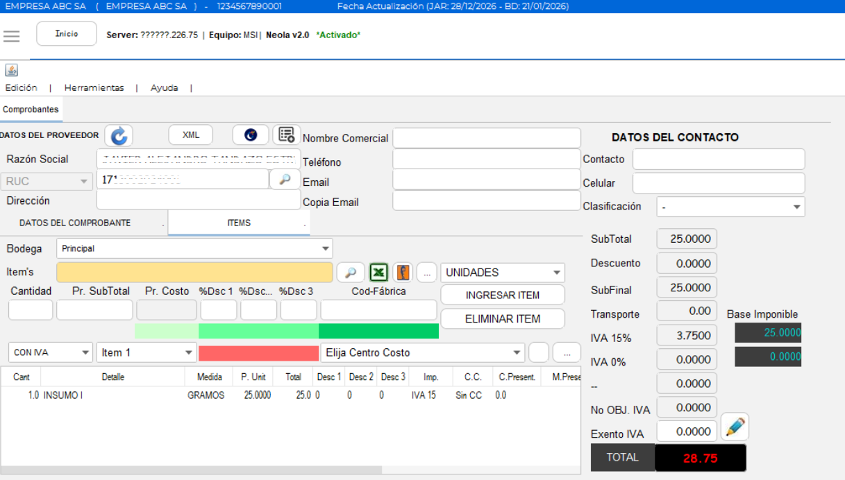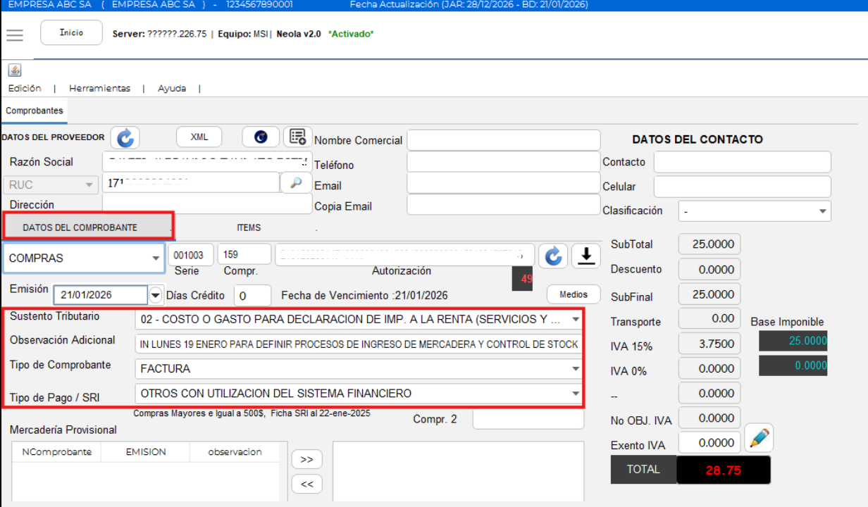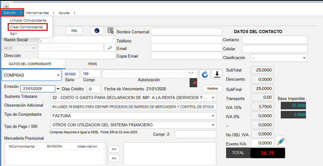 El sistema llena automáticamente la información del comprobante