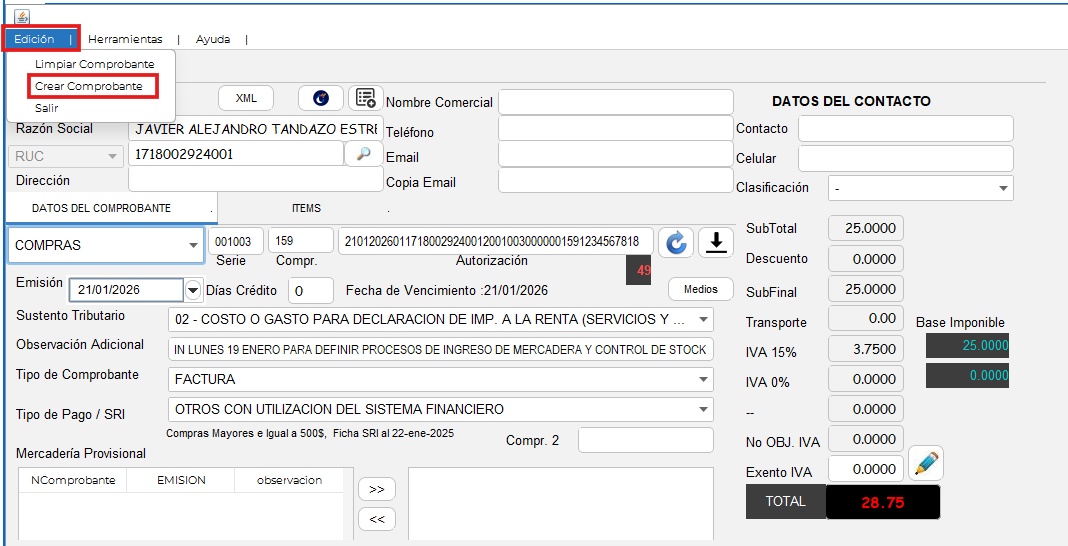 Si todo está correcto, ve a: Edición → Crear comprobante