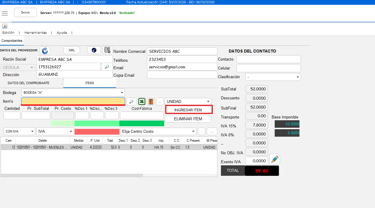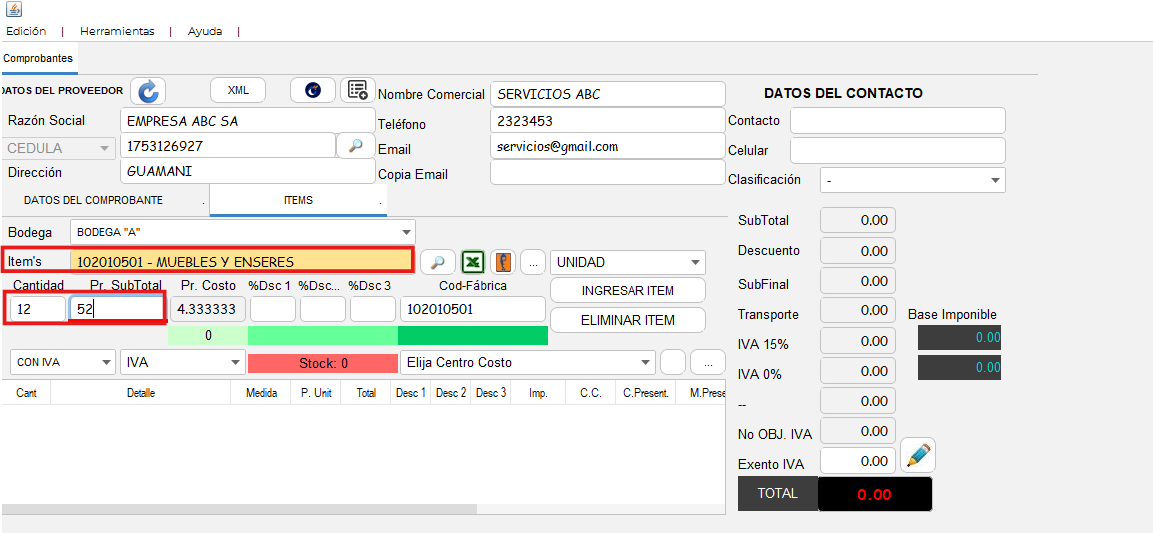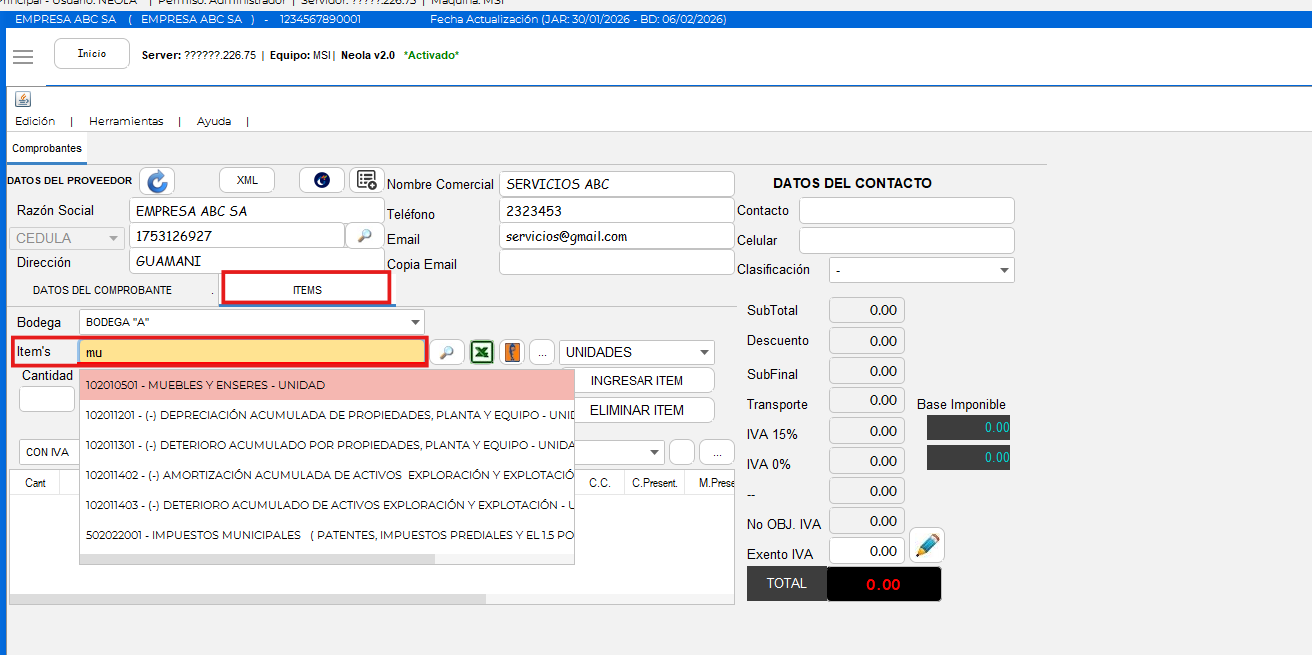 Al buscar el ítem, el sistema mostrará los ítems que ya están cargados.
