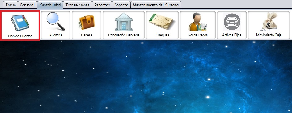 - Al ingresar a plan de cuentas, se mostrará la siguiente pantalla, selecciona la opción Plan de Cuentas