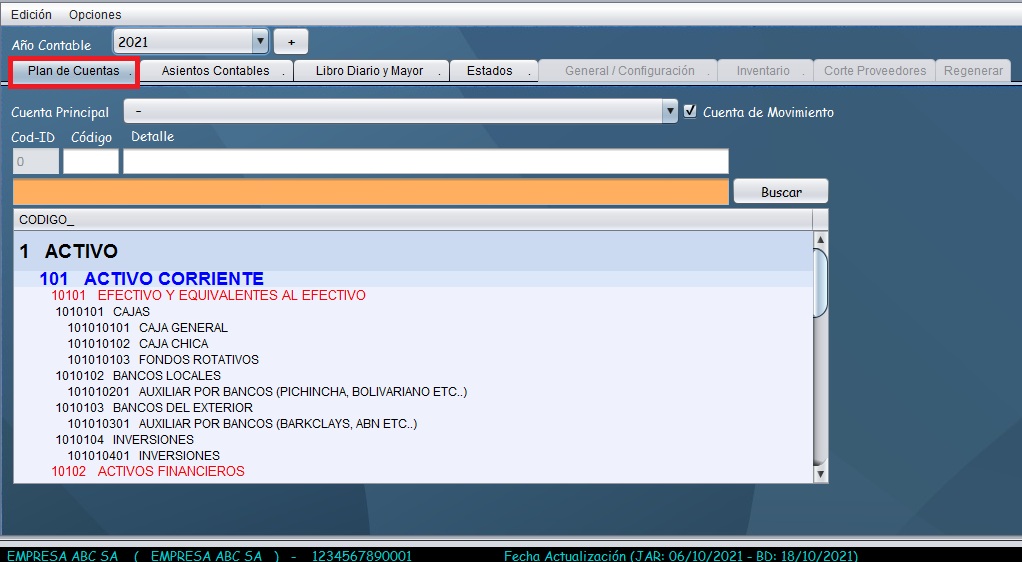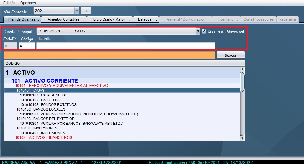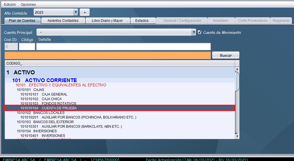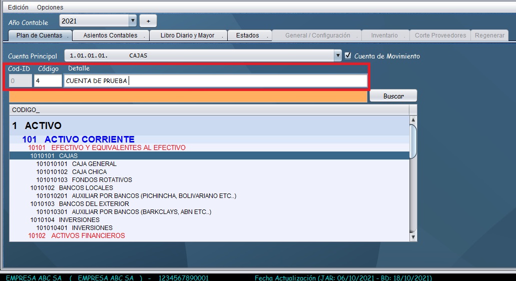 - El sistema mostrará la nueva cuenta en la parte inferior de la pantalla, ya incluida en el plan de cuentas