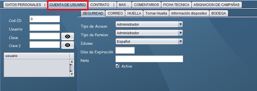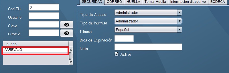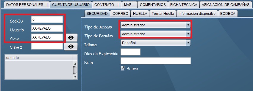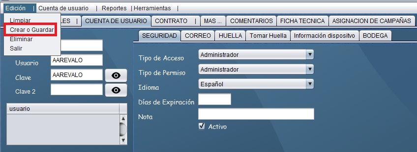 - En la parte derecha, coloque el nombre del usuario y la clave con la que ingresará al sistema. En la parte izquierda seleccione el tipo de acceso y permiso que se le otorgará al usuario