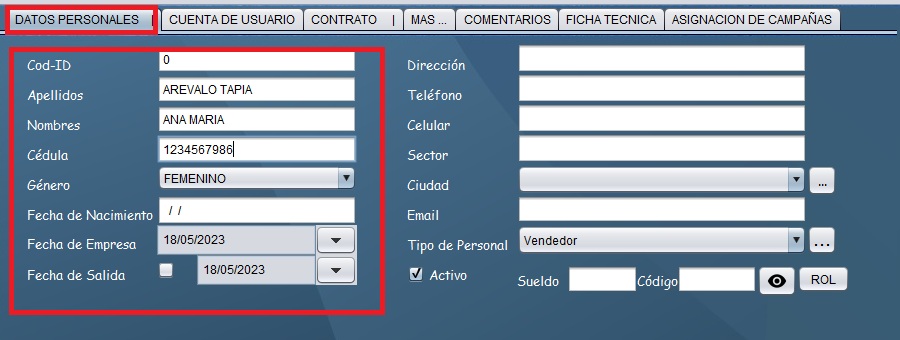 - En la pestaña de Datos Personales, ingrese los datos del nuevo usuario que necesita crear.
