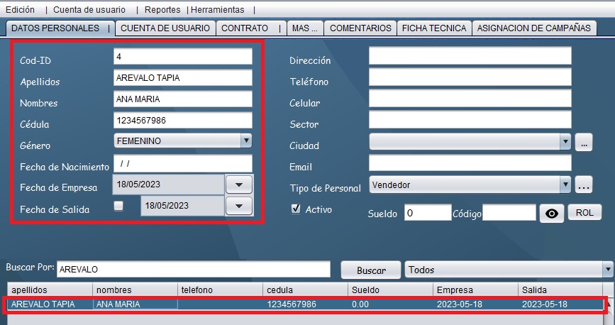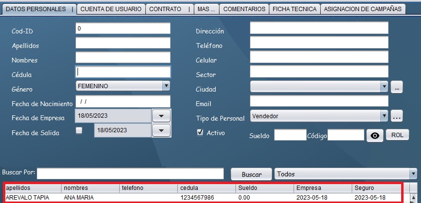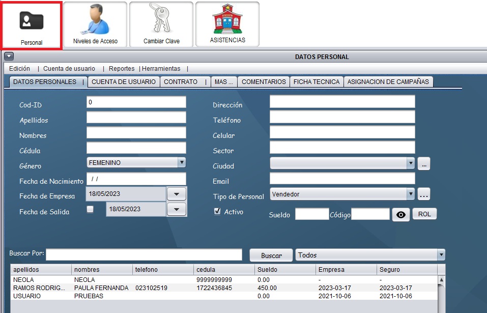 - En la parte inferior, con doble clic seleccione el personal al que le creará la cuenta de usuario
