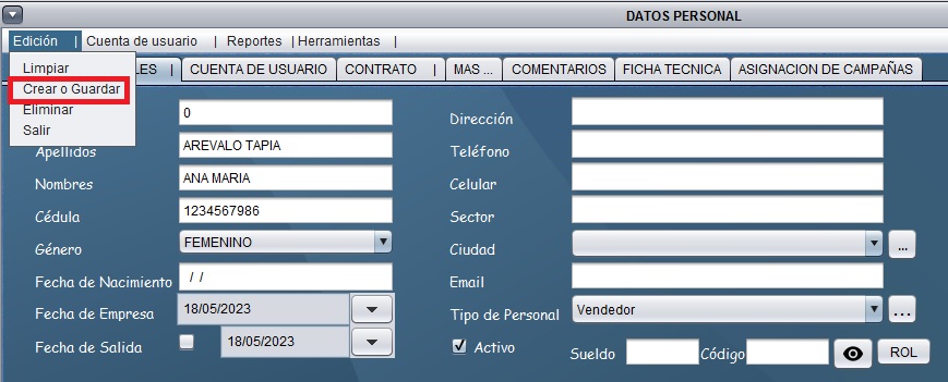 - Una vez que ingresados los datos, diríjase a la pestaña "Edición" y clic en "Crear o Guardar"