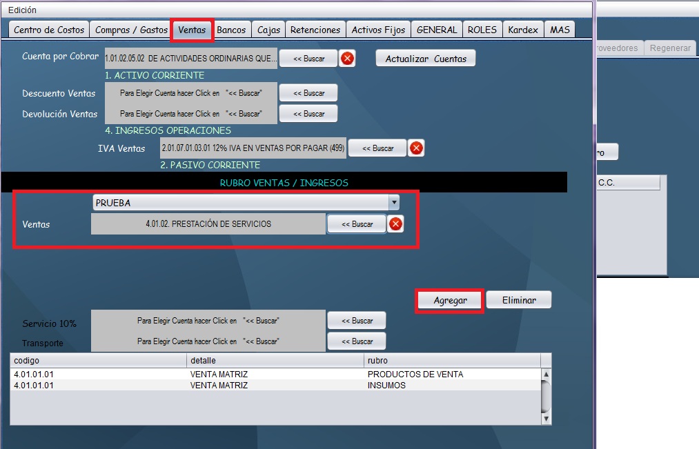 - En la pestaña de Ventas, diríjase a Rubros Ventas/ Ingresos, coloque la informacion del Rubro y la cuenta a la que neceita enlazar y clic en Agregar.