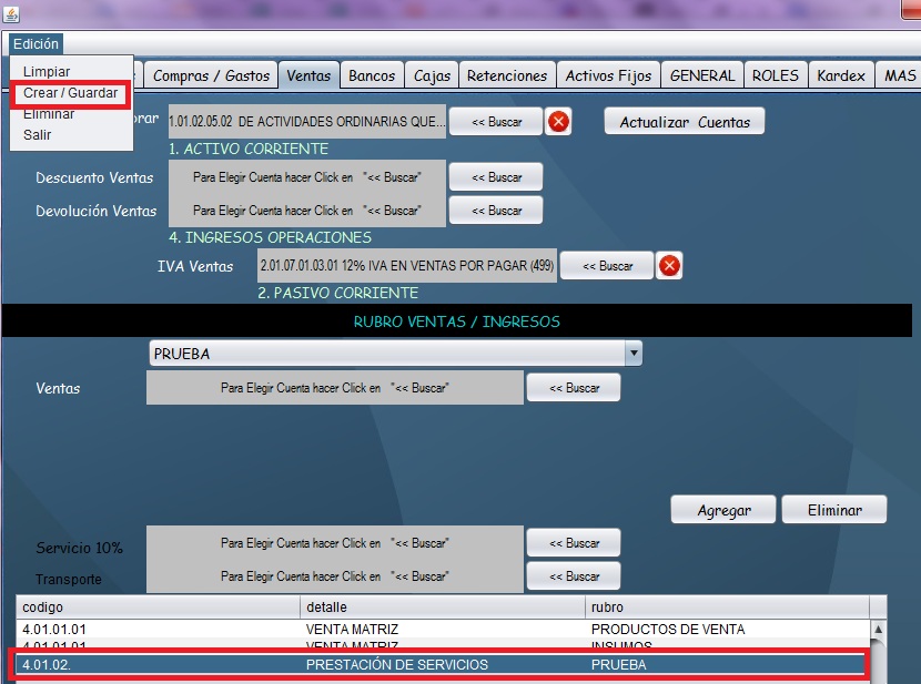 - Una vez que ya esté agregado, clic en Edicion y Crear o Guardar