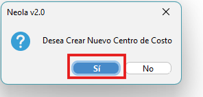 - Aparecer谩 una ventana de confirmaci贸n con el mensaje "Desea crear nuevo centro de costo", seleccione SI聽