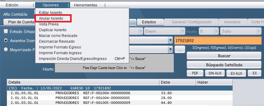 - Una vez ubicado el diario, seleccionamos, y nos dirijimos a la pestaña "Opciones" y clic en "Anular Asiento"