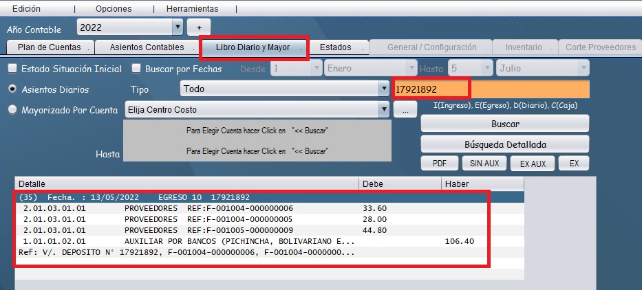 - En el módulo de Plan de Cuentas, nos dirijimos a la pestaña "Libro diario y Mayor" y en la barra color naranja podemos buscar el N° de asiento diario que necesitamos anular.