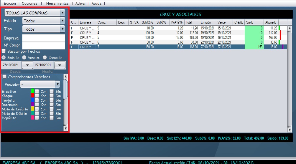 - Con ayuda de los filtros ubique la compra en la cual se emitió la retención que desea anular.