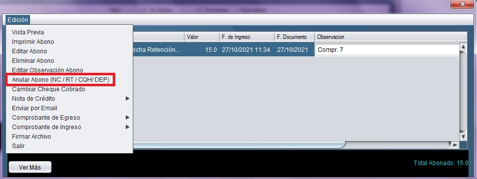 - Seleccione la retención y diríjase al menú "Edición" y seleccione la opción "Anular abono (NC/RT/CQH)"