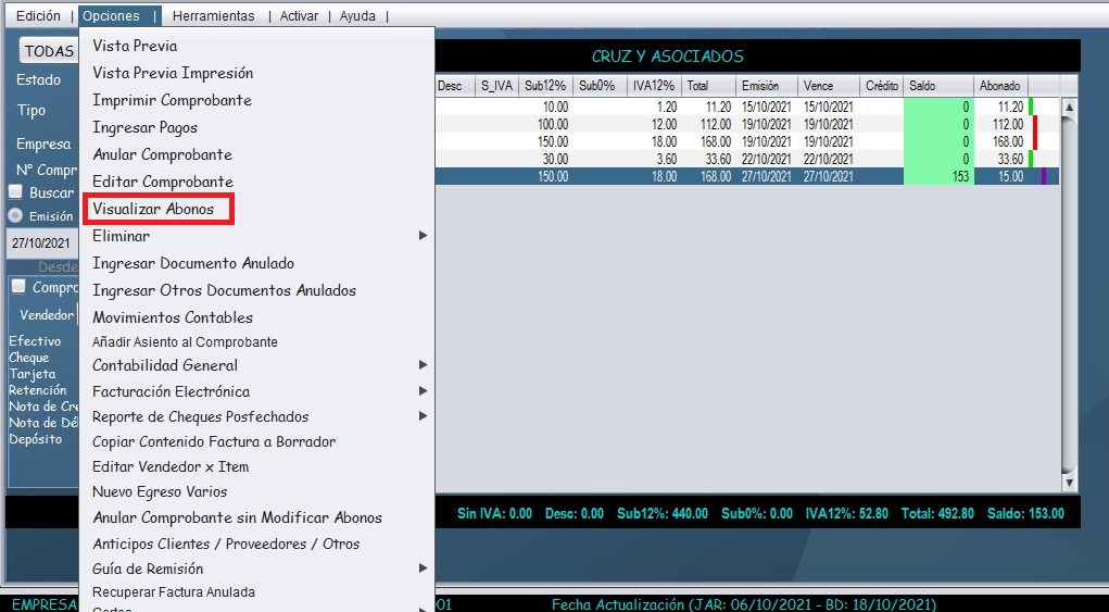 - Una vez ubicada la compra, seleccione el comprobante y diríjase al menú "Opciones" y seleccione "Visualizar abonos"