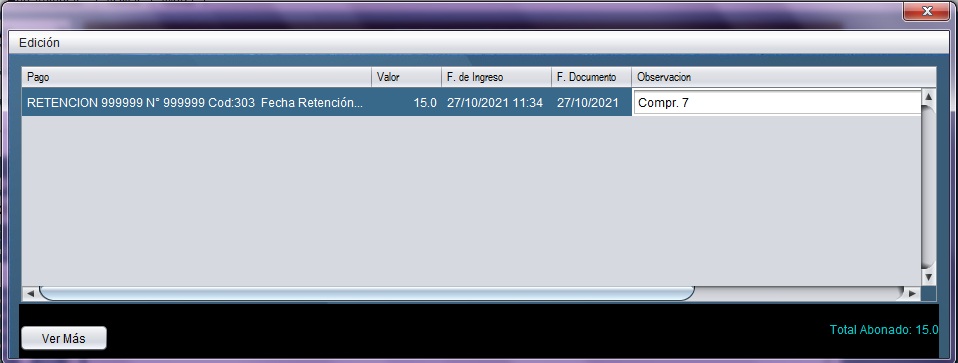 - Se mostrará la siguiente ventana con los detalles de los pagos ingresados en ese comprobante.
