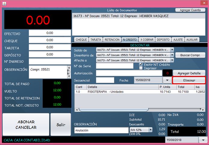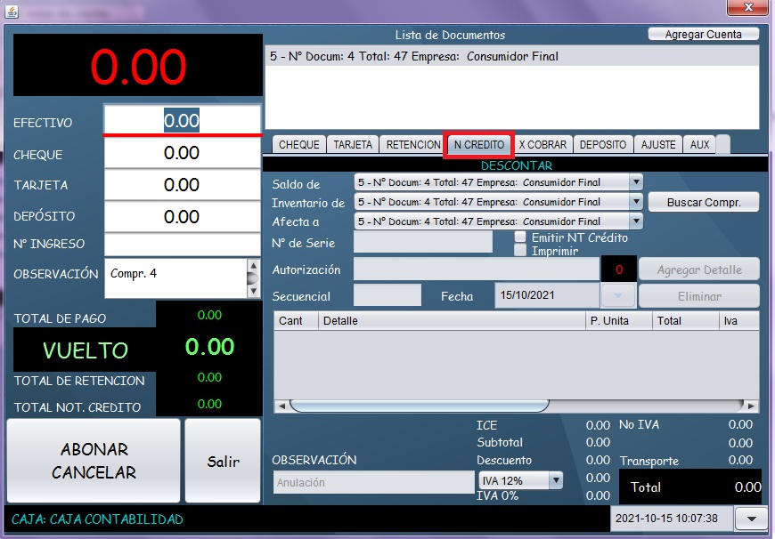 - Se mostrará la siguiente pantalla, que es el módulo de pagos, una vez dentro del módulo de pagos, diríjase a la pestaña “N CREDITO”, el sistema ya toma los datos de la factura seleccionada anteriormente.
