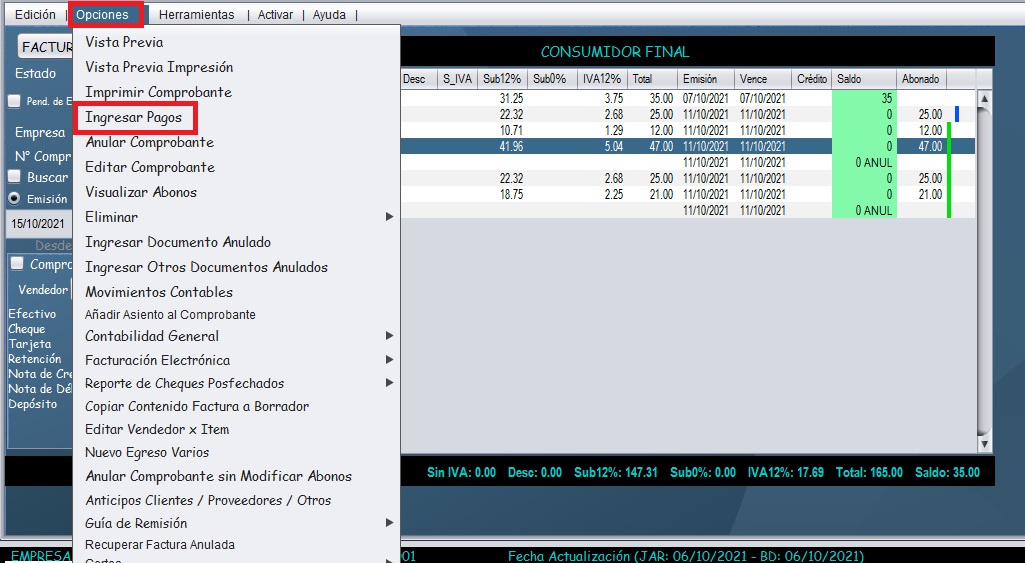 - Seleccione la factura, dé clic en “Opciones” y seleccione la opción “Ingresar pagos”.