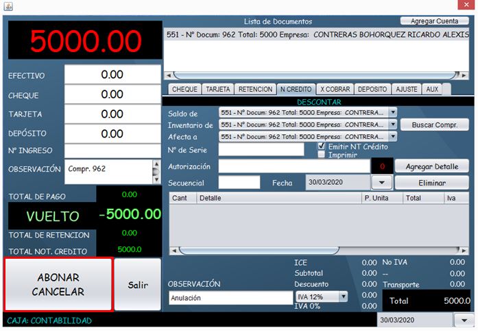 - Finalmente verifique que todos los datos sean correctos y presione el boton "Abonar/Cancelar"