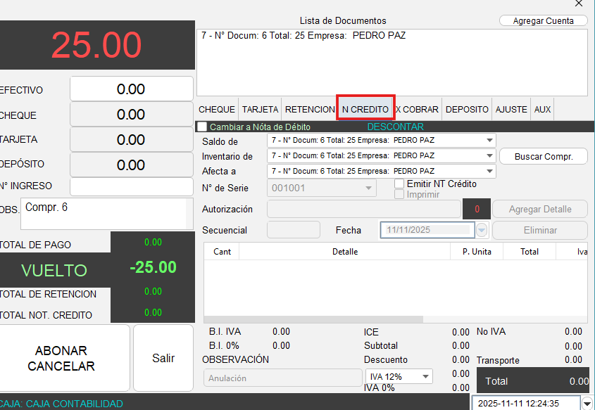 - Se mostrará la siguiente pantalla, que es el módulo de pagos, una vez dentro del módulo de pagos, diríjase a la pestaña “N CREDITO”, el sistema ya toma los datos de la factura seleccionada anteriormente.