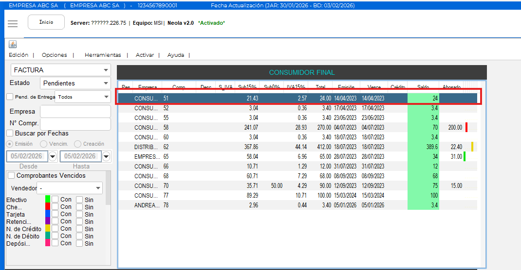 - Con la ayuda de los filtros busque la factura de la cual se va a emitir la nota de crédito.