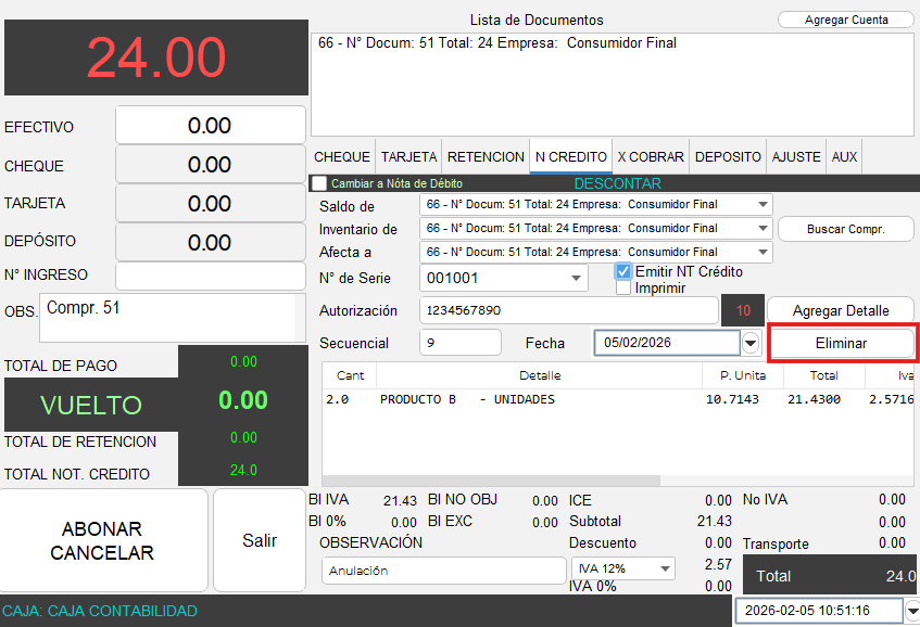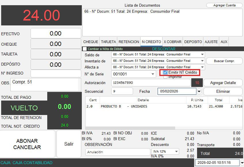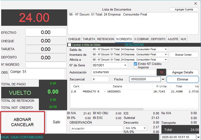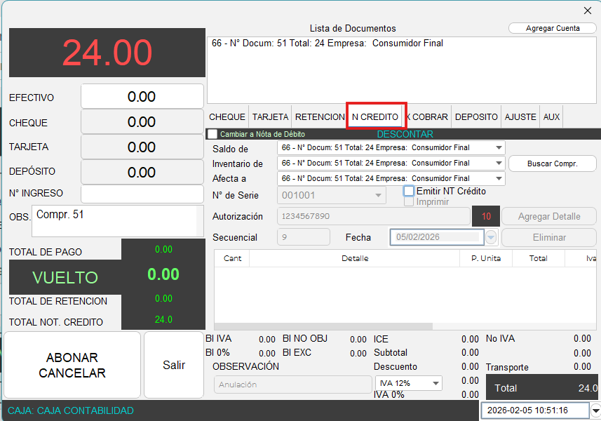 - Se mostrará la siguiente pantalla, que es el módulo de pagos, una vez dentro del módulo de pagos, diríjase a la pestaña “N CREDITO”, el sistema ya toma los datos de la factura seleccionada anteriormente.