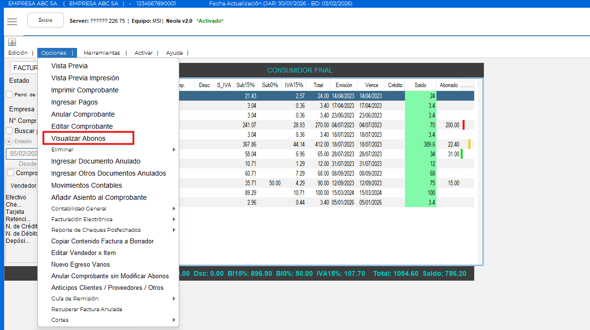 - Seleccione la factura, dé clic en “Opciones” y seleccione la opción “Ingresar pagos”.