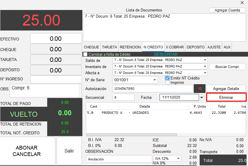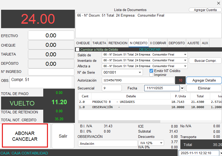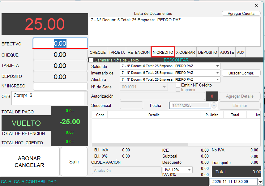 - Se mostrará la siguiente pantalla, que es el módulo de pagos, una vez dentro del módulo de pagos, diríjase a la pestaña “N CREDITO”, el sistema ya toma los datos de la factura seleccionada anteriormente.